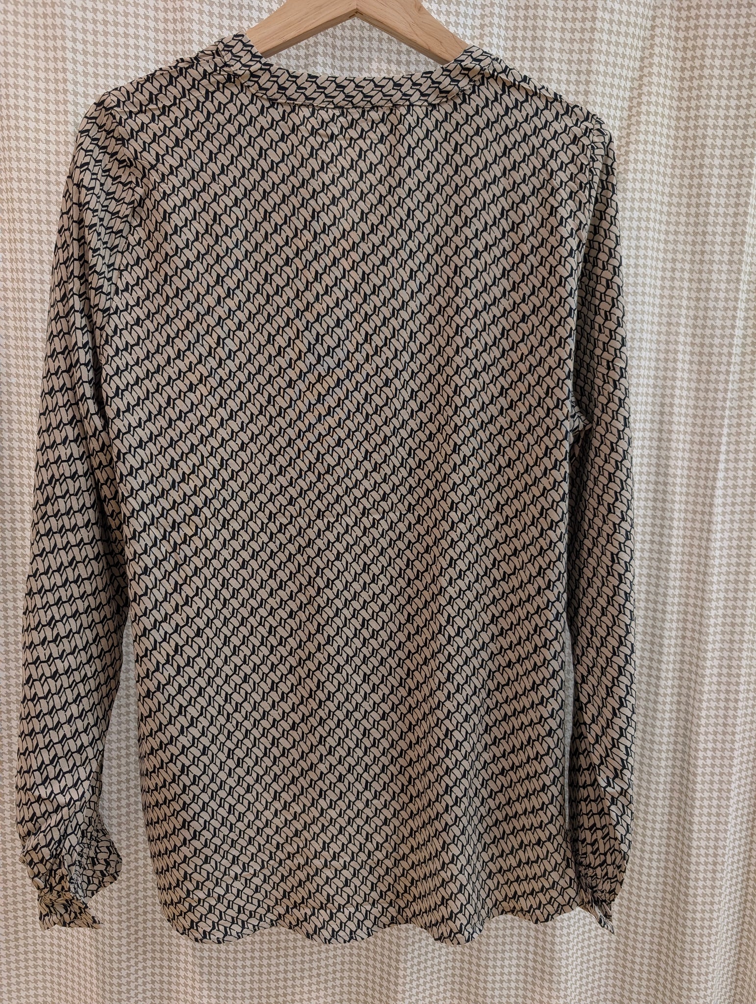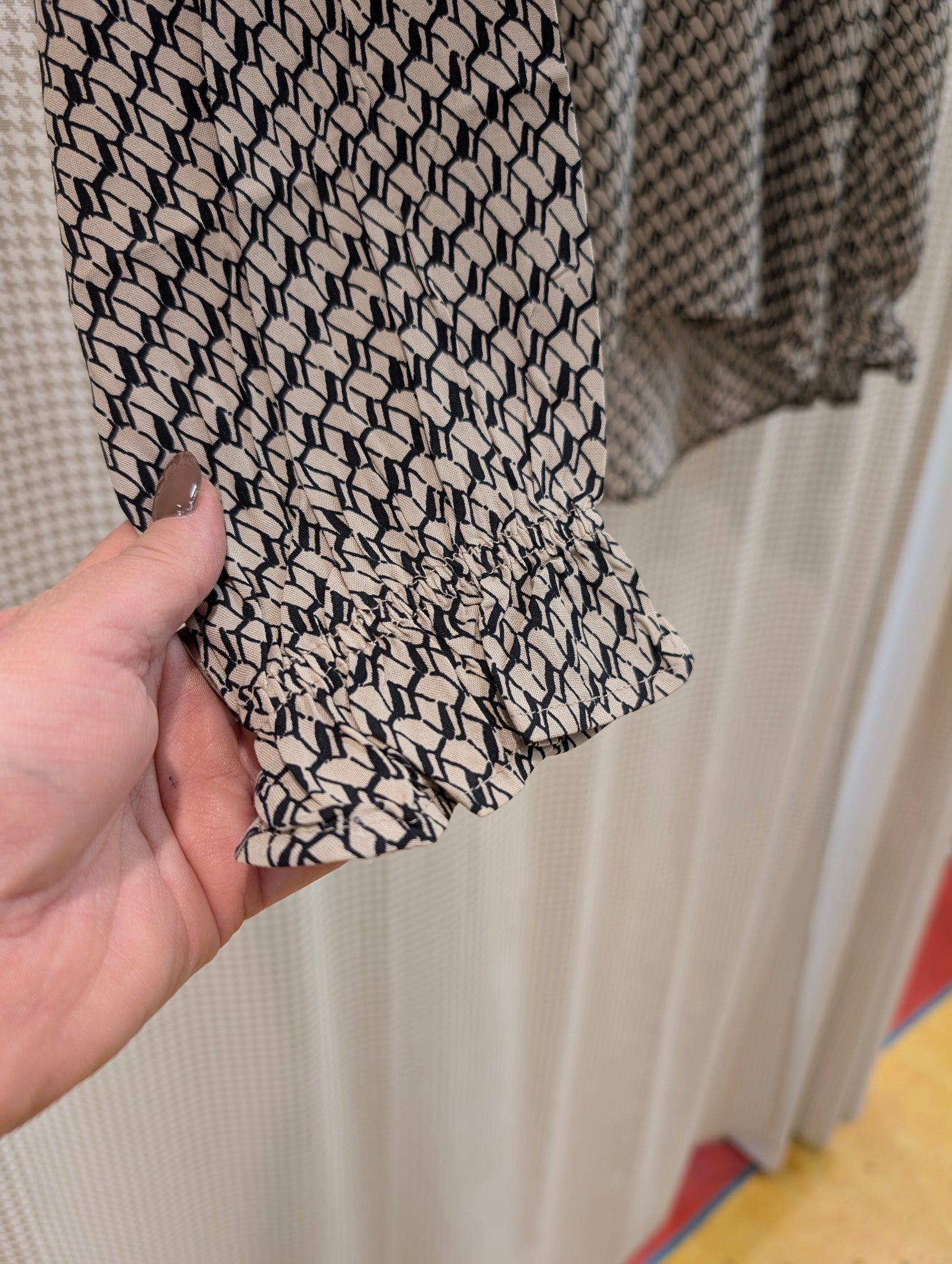 Diese schöne Viscosebluse in der Farbe beige hat ein schwarzes grafisches Muster. Sie hat einen geschlitzten Rundhalsausschnitt und ist Langarm. Die Ärmelabschlüsse sind gerafft und Besonders. Man kann sie als Eyecatcher toll unterm Blazer hervorschauen lassen.