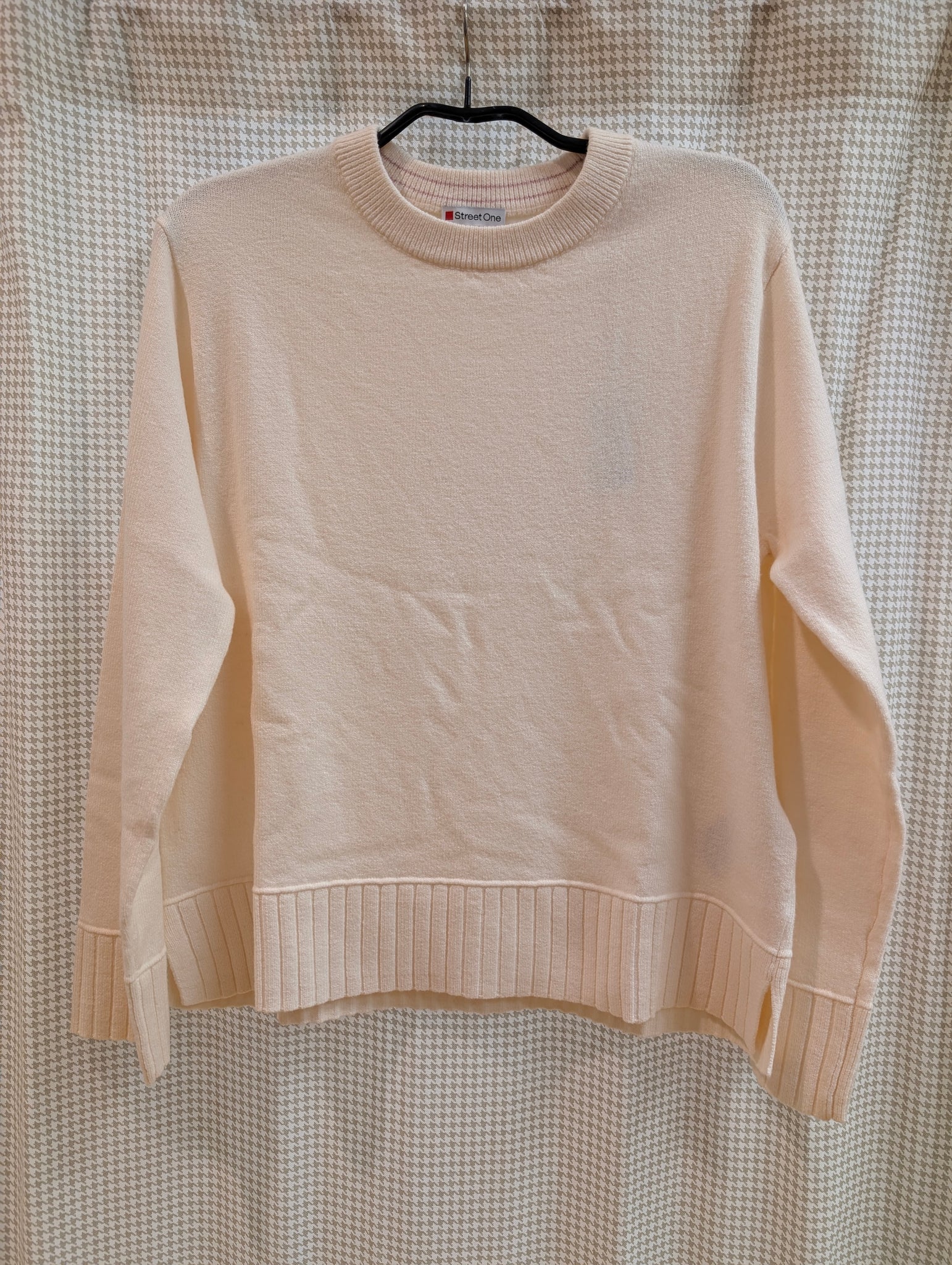 Er hat einen Rundhalsausschnitt und ist Langarm und er ist dicker, also recht kuschelig.
