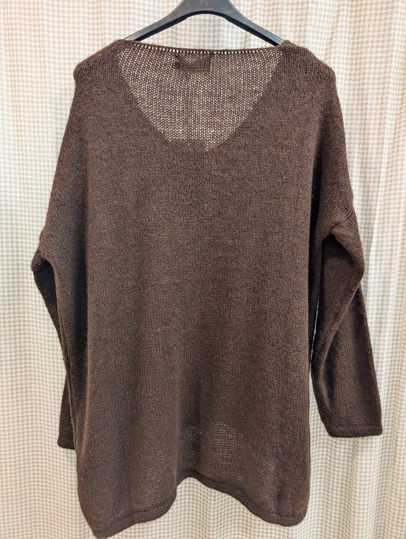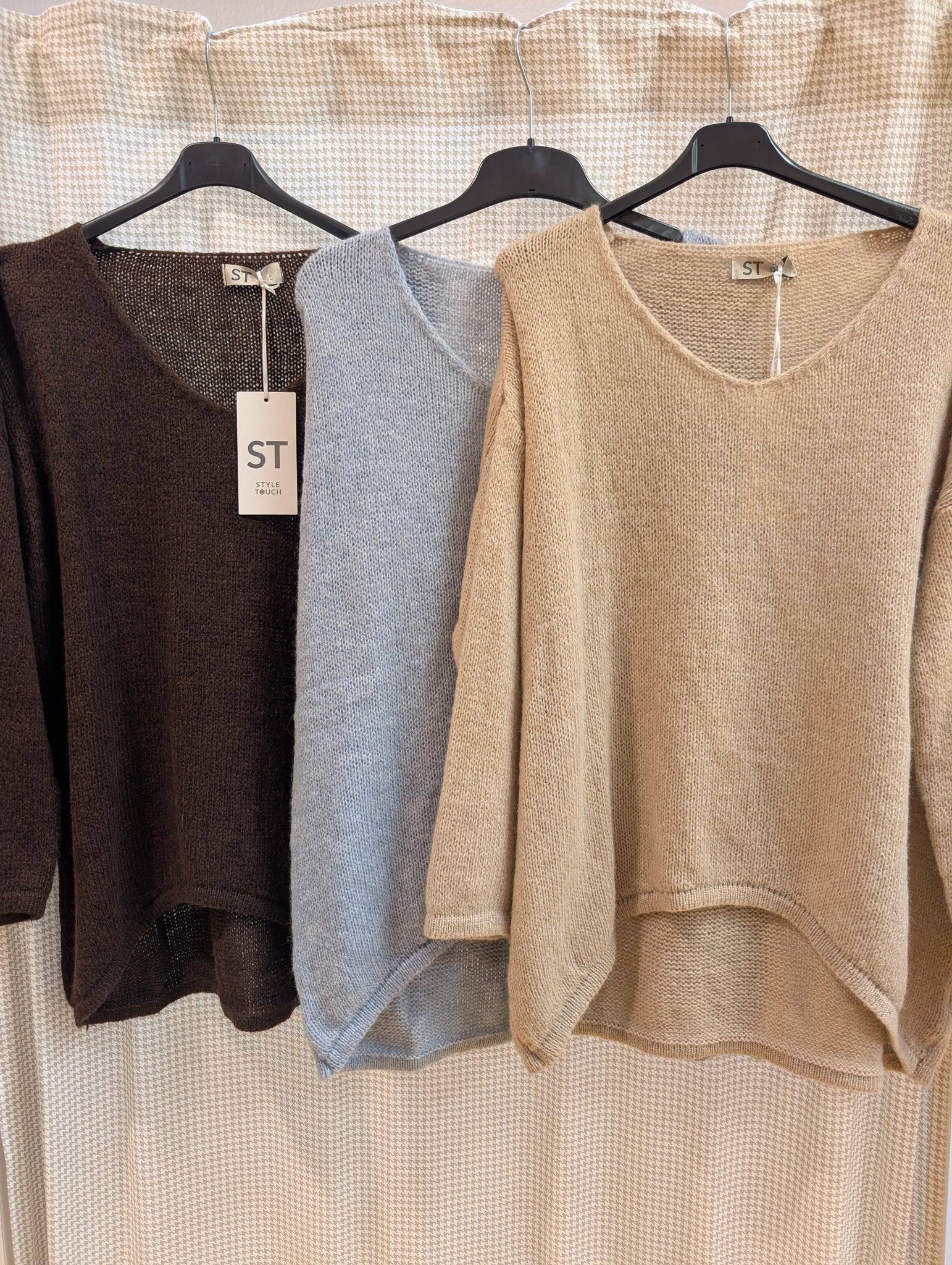 Dieser einfarbige Strickpullover hat einen V- Ausschnitt und er ist vorne kürzer als hinten .Der Schnitt sieht mit einem Top oder T-Shirt angezogen super aus !